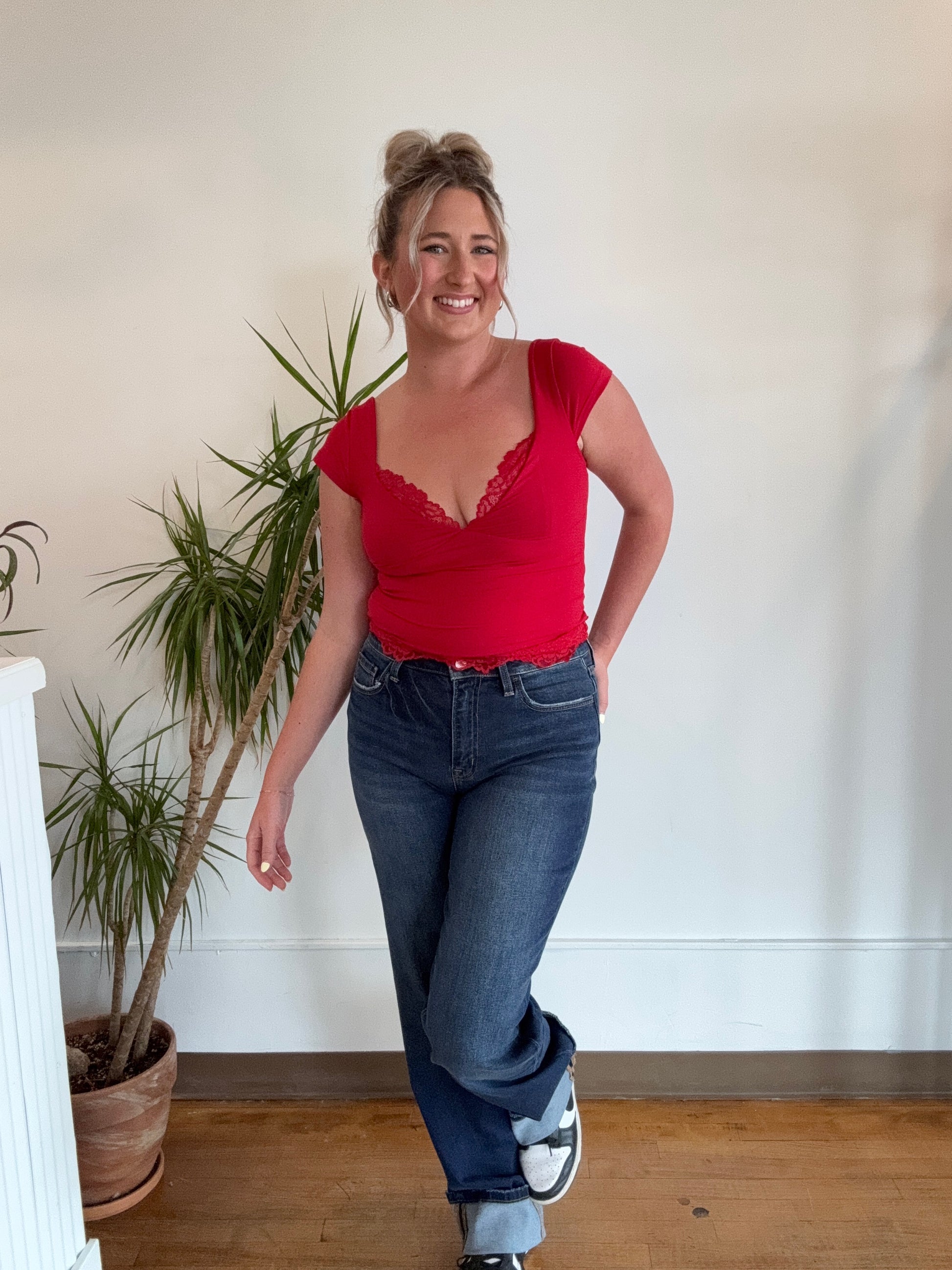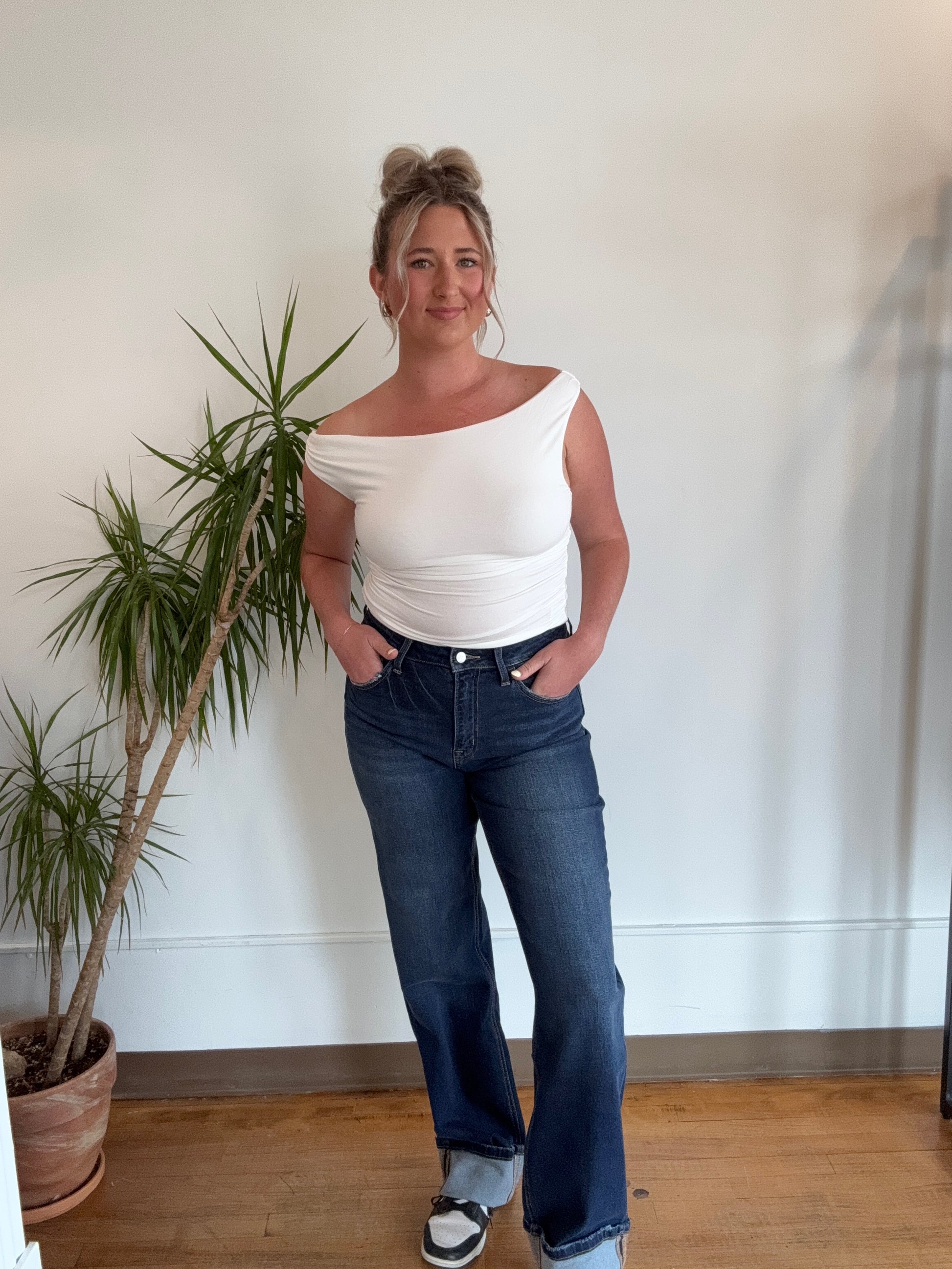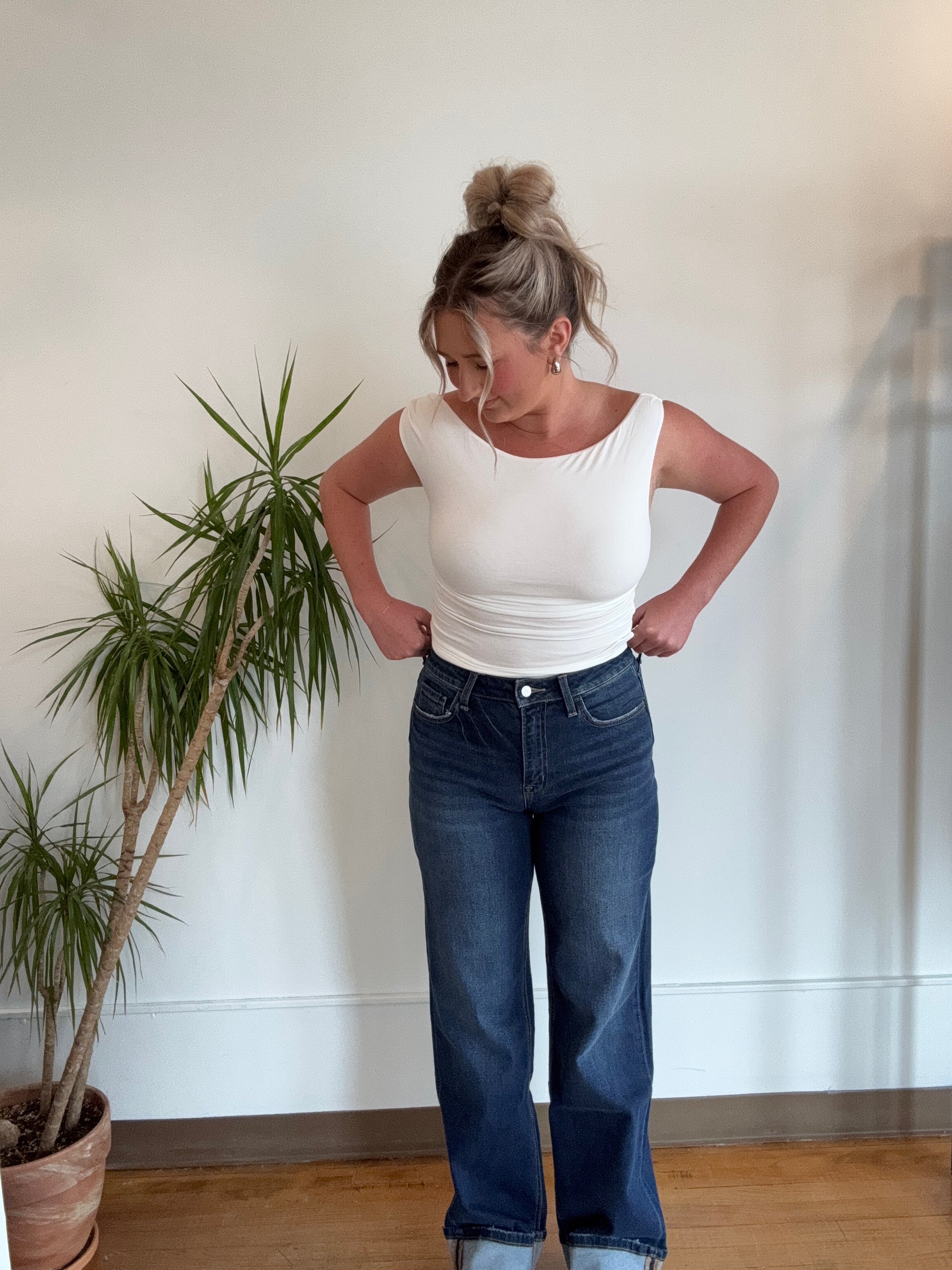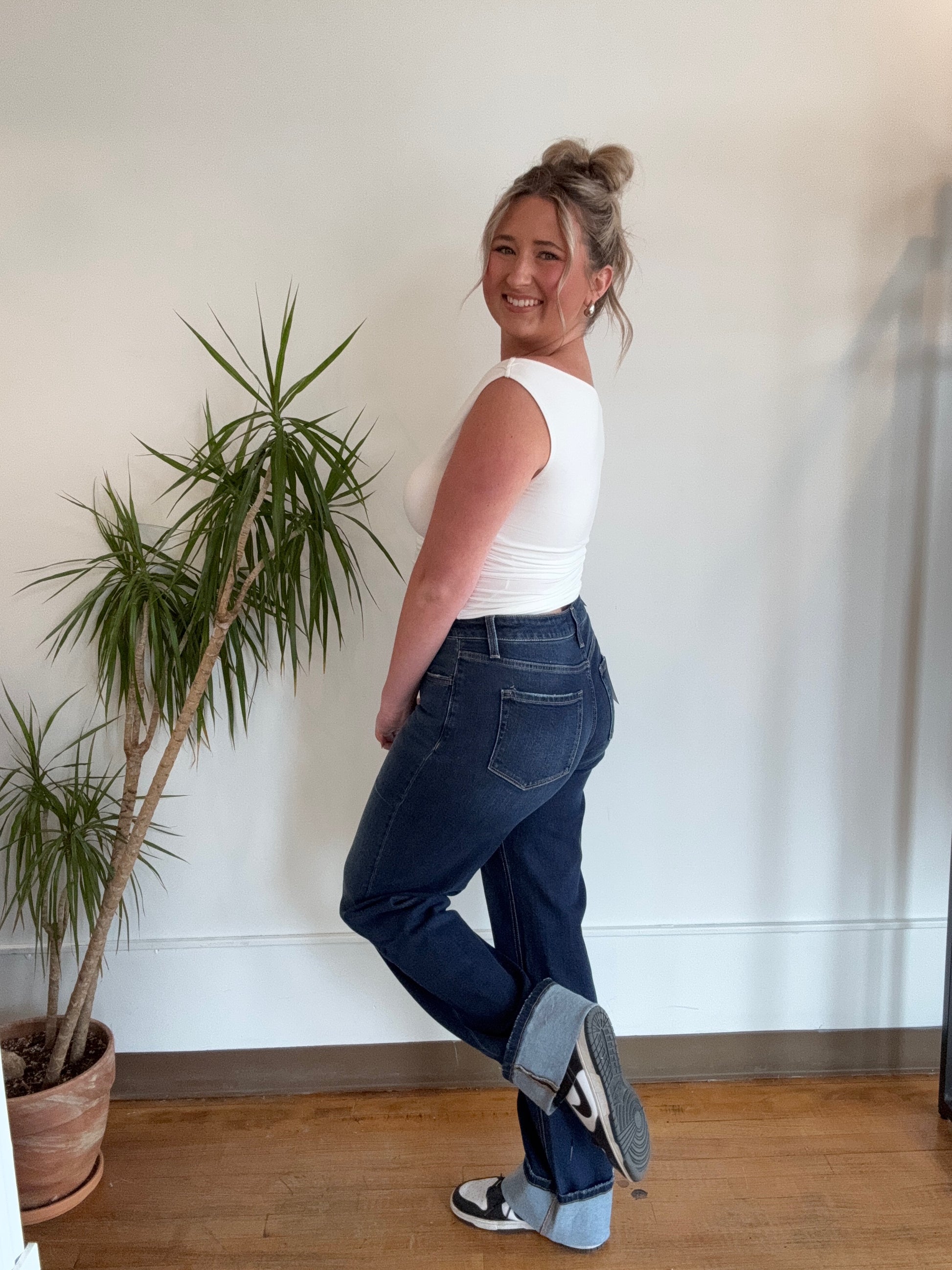 High rise cuffed denim by Lovervet a vervet brand that features stretch denim and tummy control.