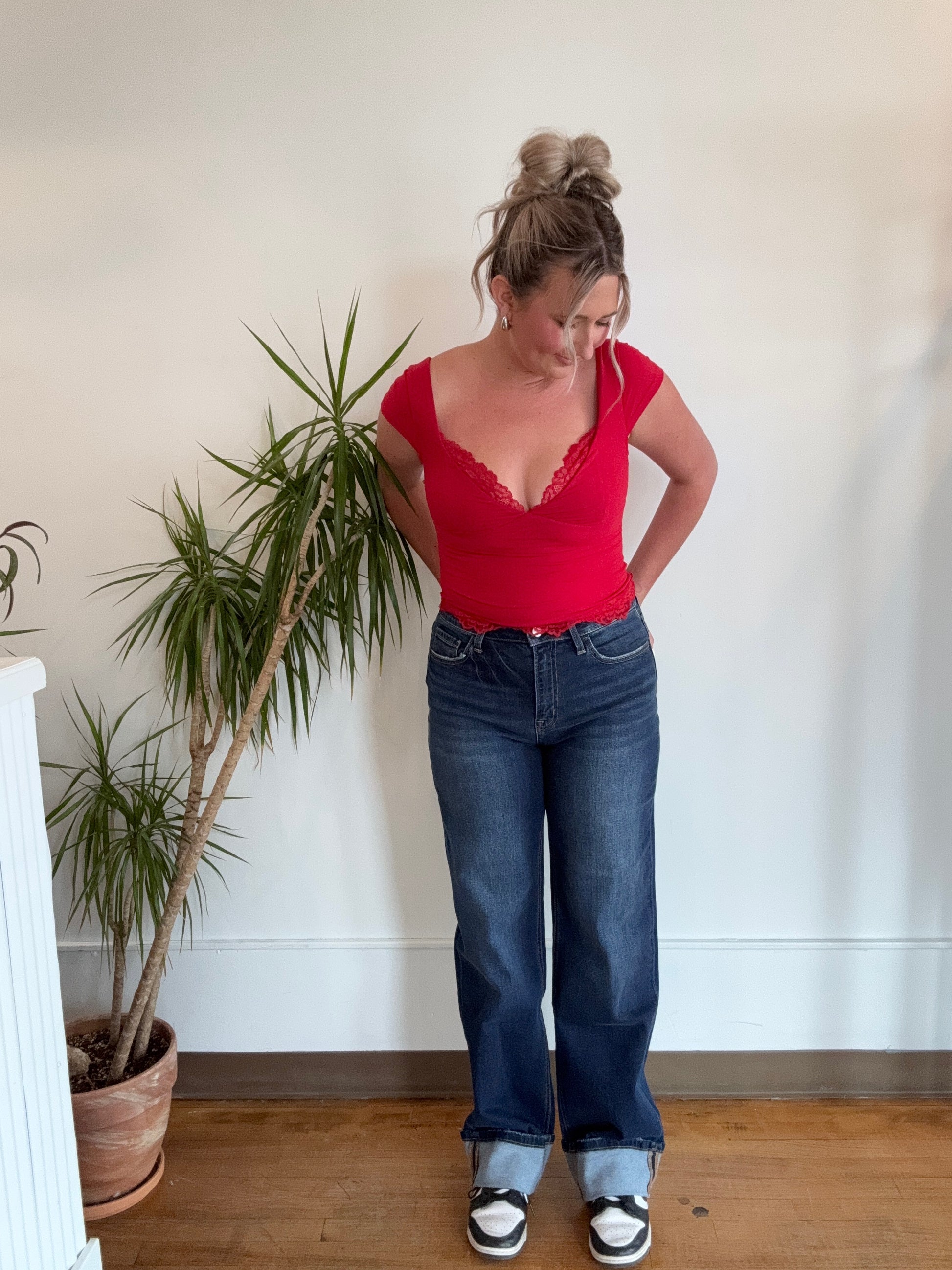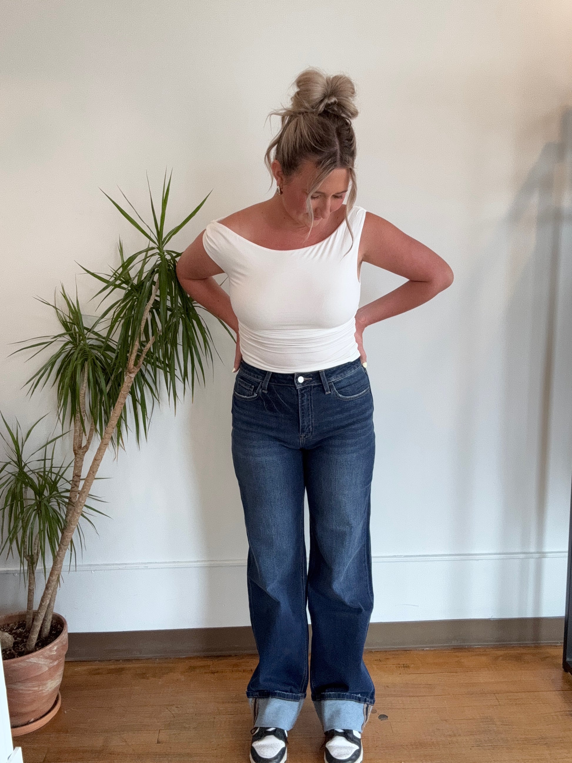 High Rise Wide Leg Dark Cuffed Denim
