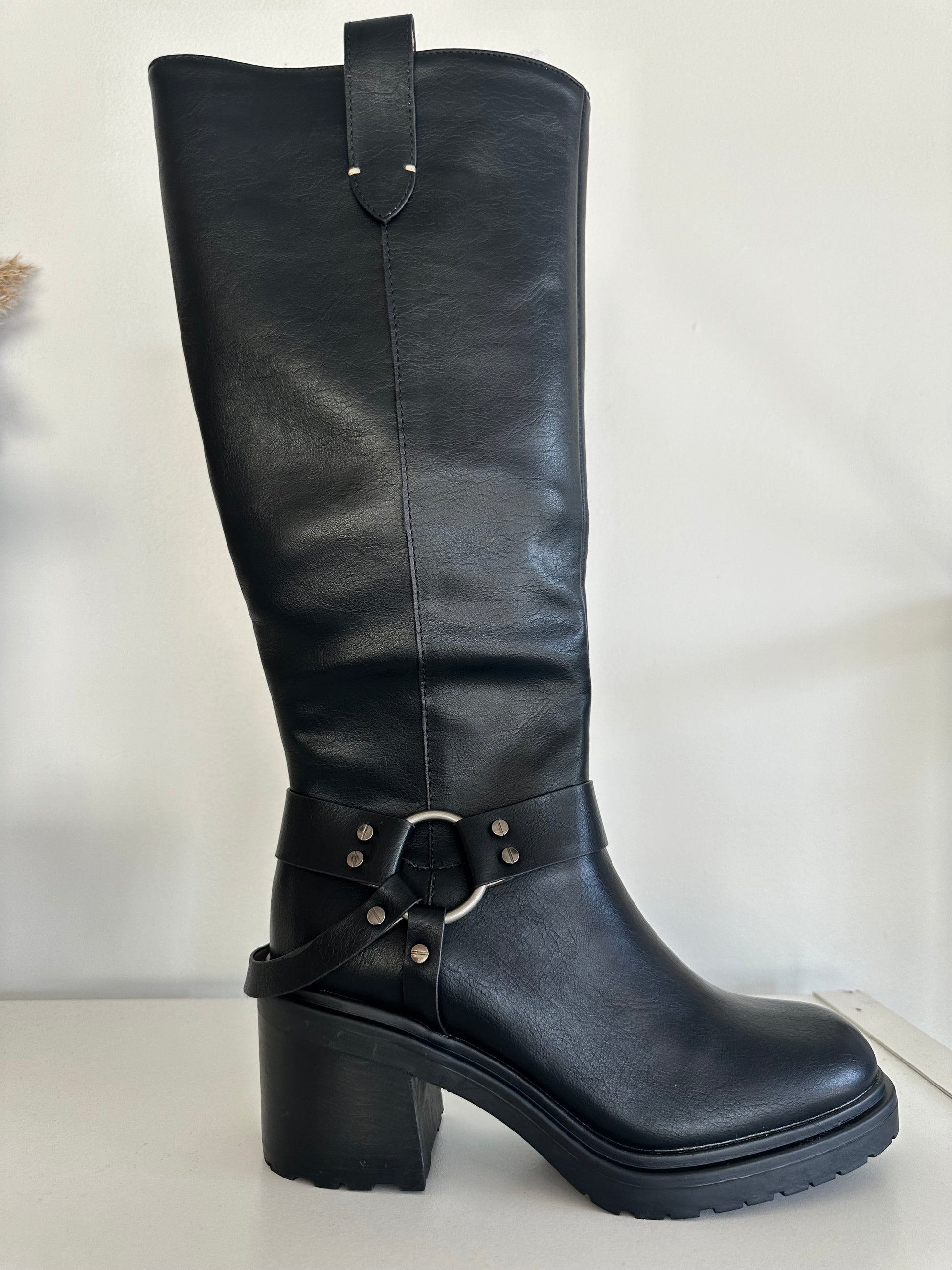 Introducing The LEANNE: Moto-inspired with a modern twist, this knee-high boot features bold buckles, a sleek silhouette, and a rugged edge. Crafted with atelier-picked materials, The Leanne adds a touch of rebellion to your wardrobe, perfect for making a statement in any weather.