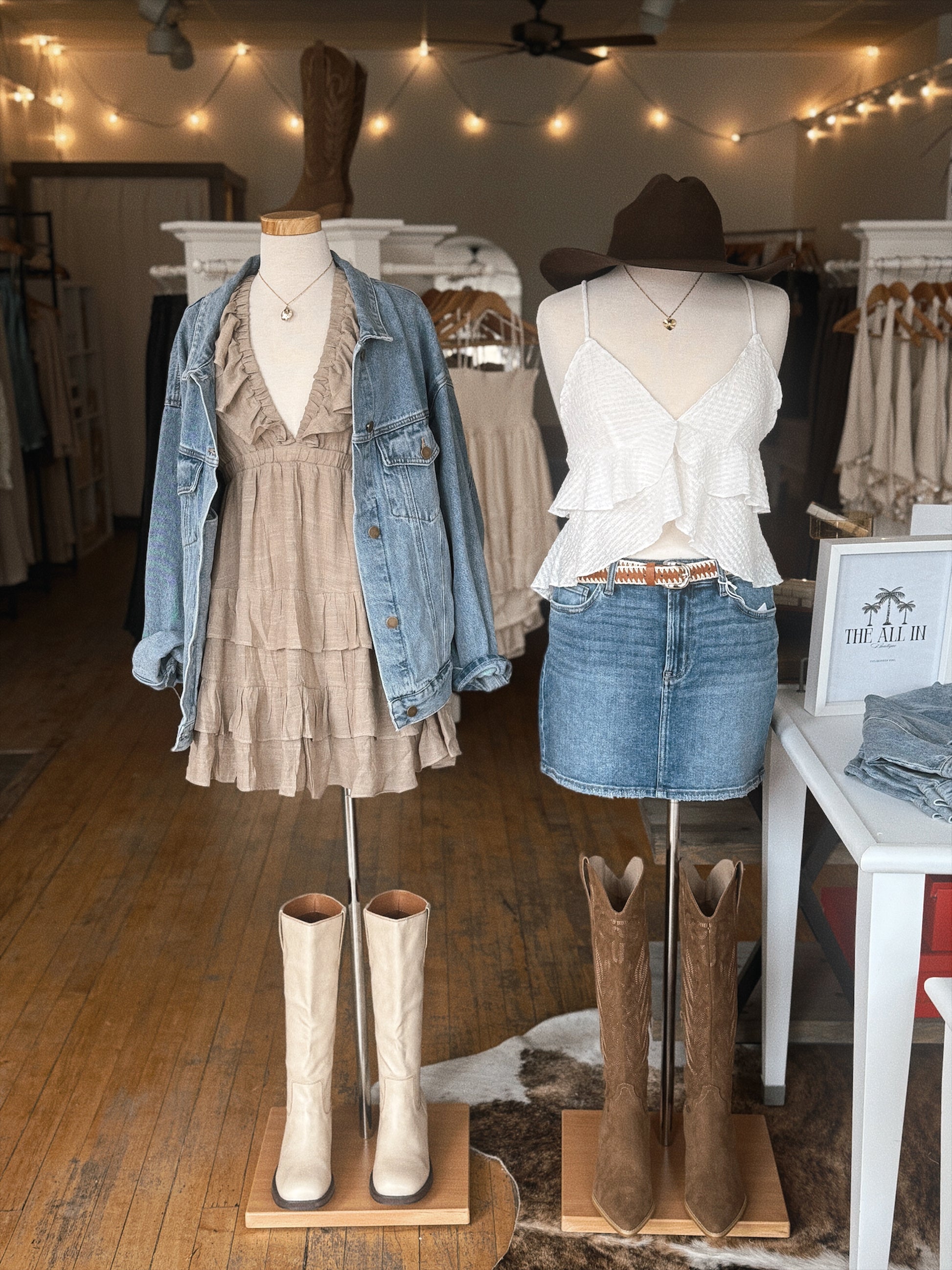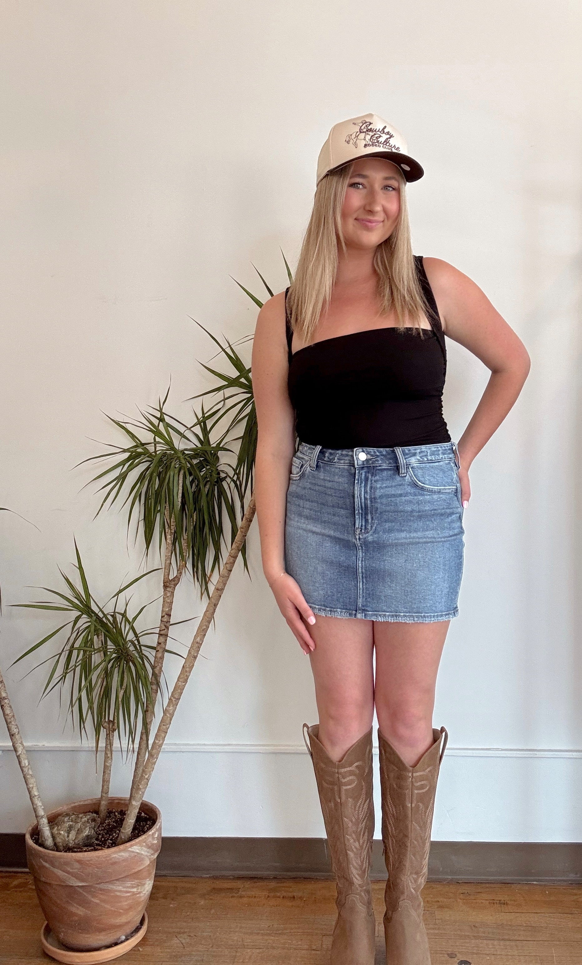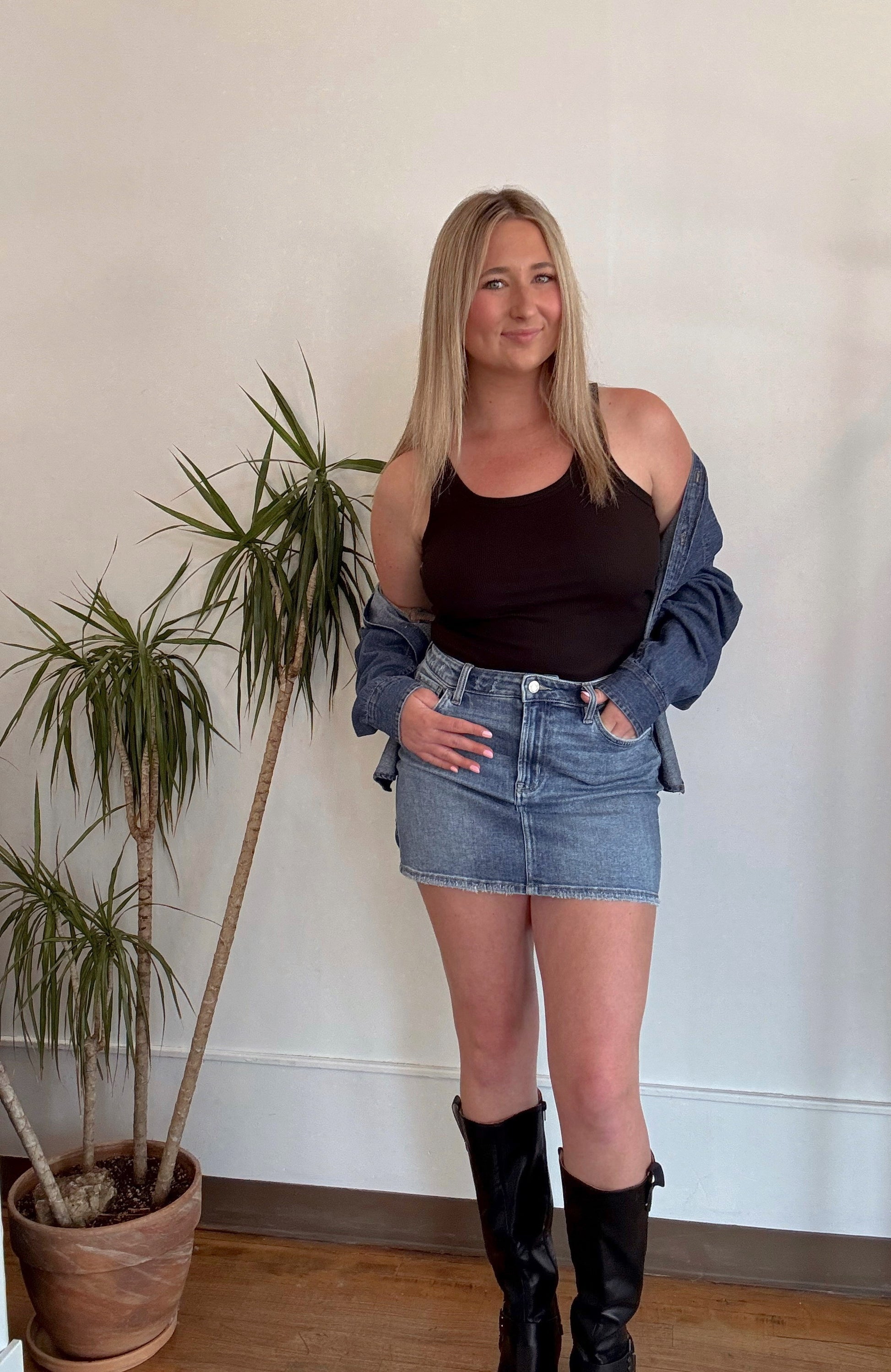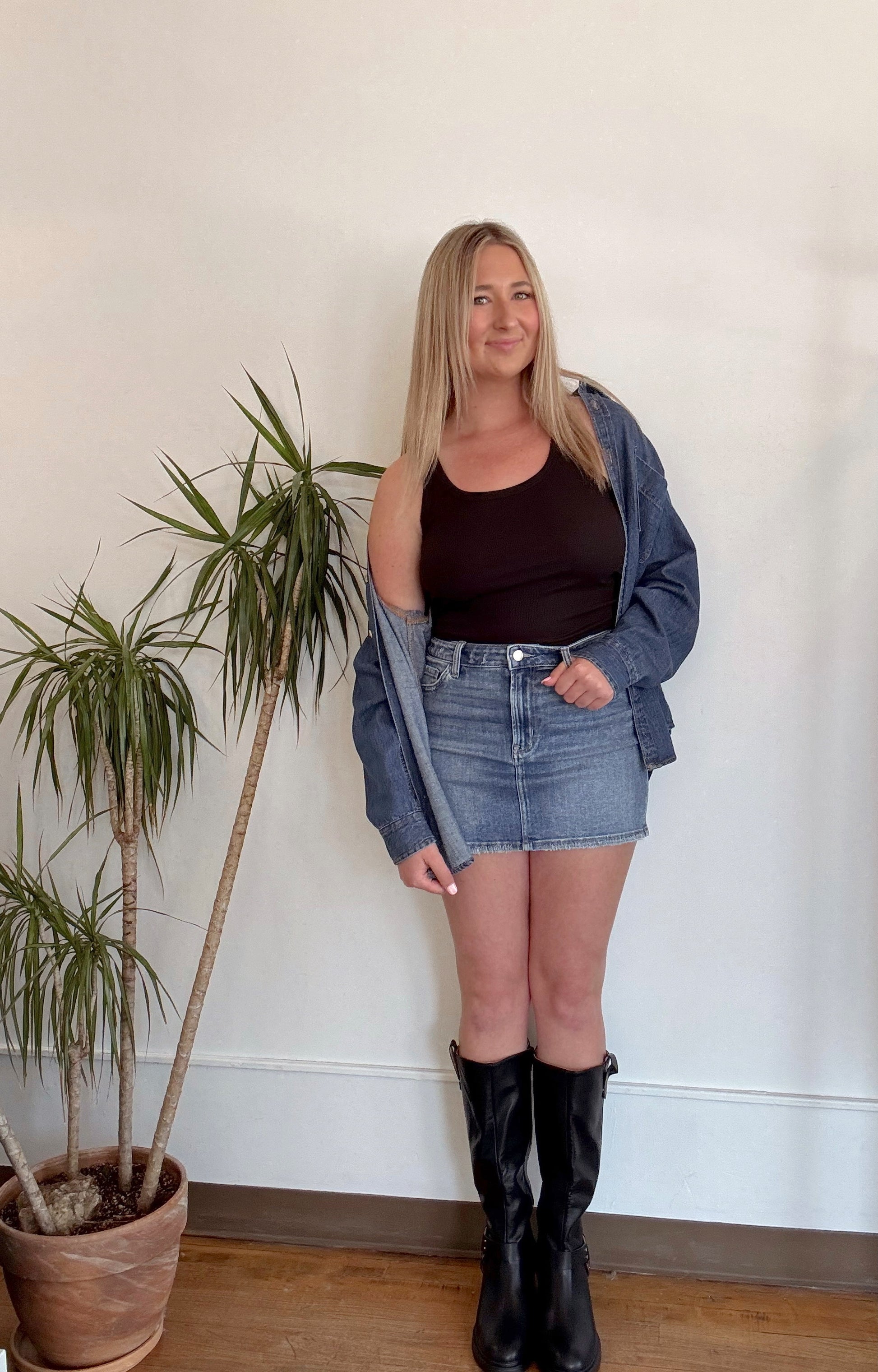Meet your new favorite denim essential — the Dusty Blues Mini Skirt. Designed with a flattering mid-rise fit and crafted from soft comfort stretch denim, this denim mini skirt blends laid-back western charm with everyday wearability. Perfect for pairing with boots, graphic tees, or a flirty blouse for that effortlessly cool cowgirl vibe.