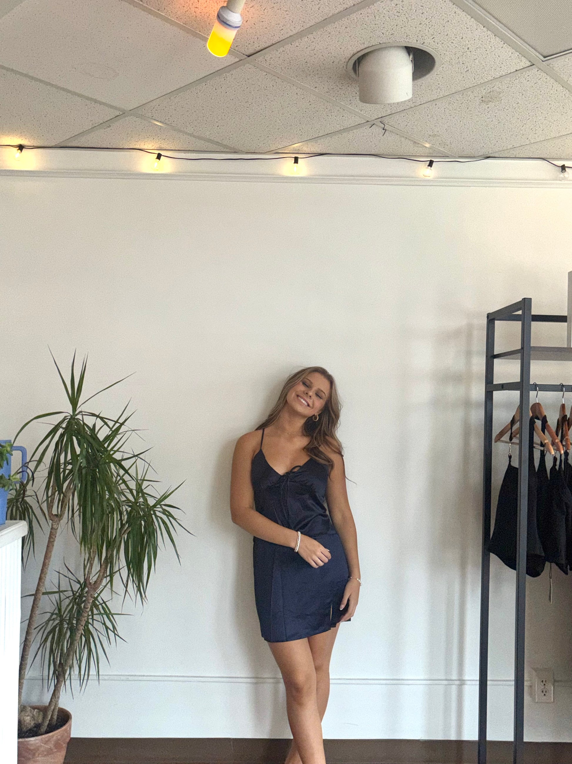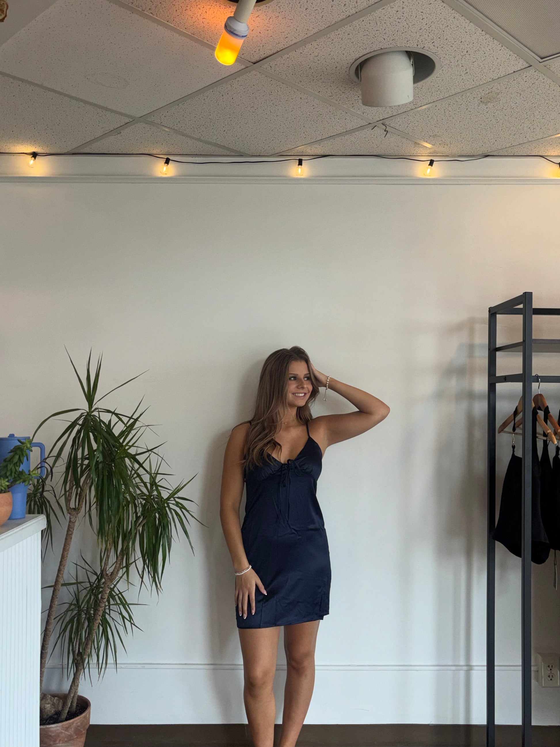 Meet the dress that does everything: the Midnight Mini Satin Slip Dress is your go-to for country concerts, cocktail parties, NFR nights, and unforgettable date nights. Crafted in a rich deep navy satin, this stunner features a sultry V-cut neckline, adjustable straps, and a front tie detail that adds the perfect touch of flirt.