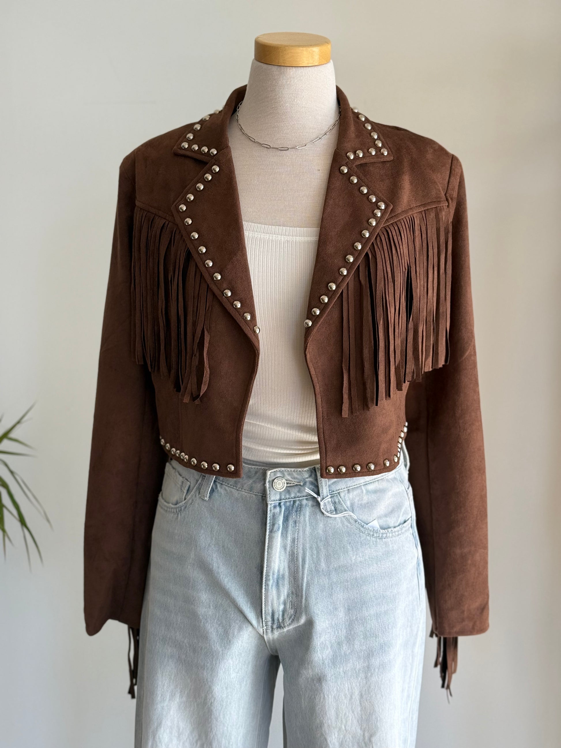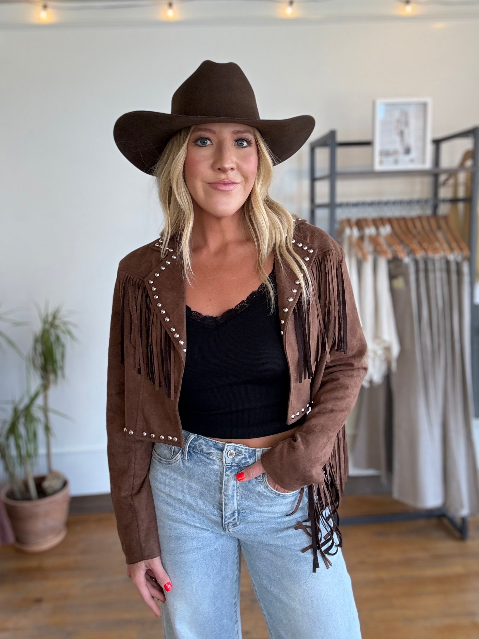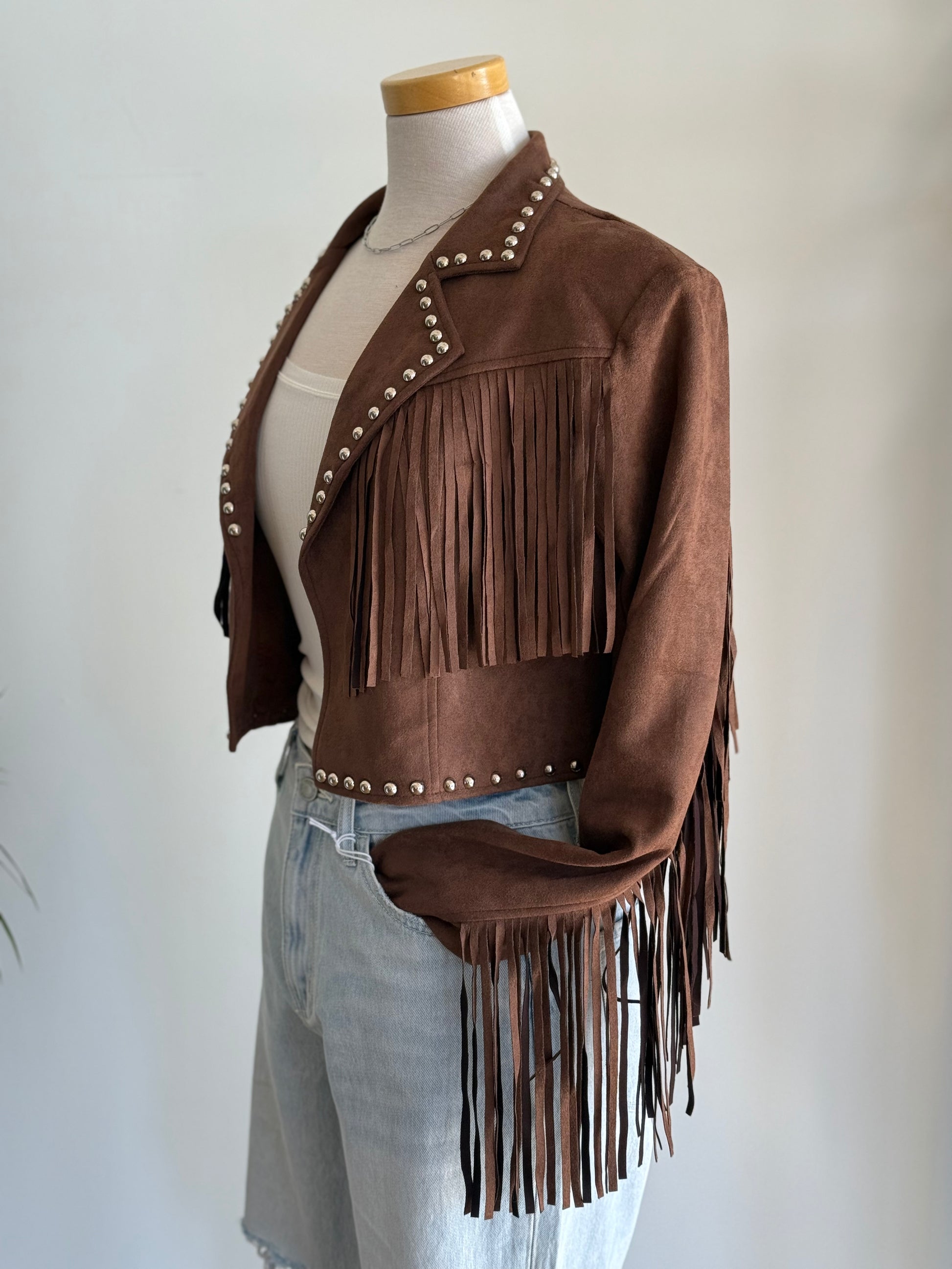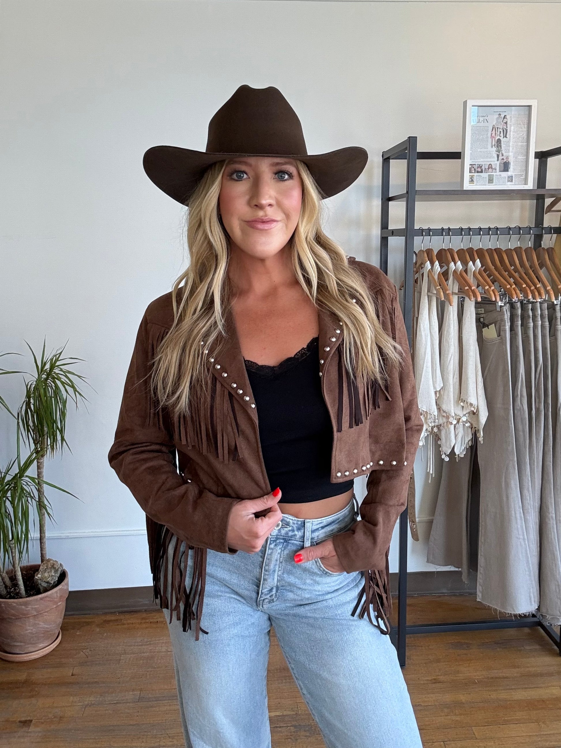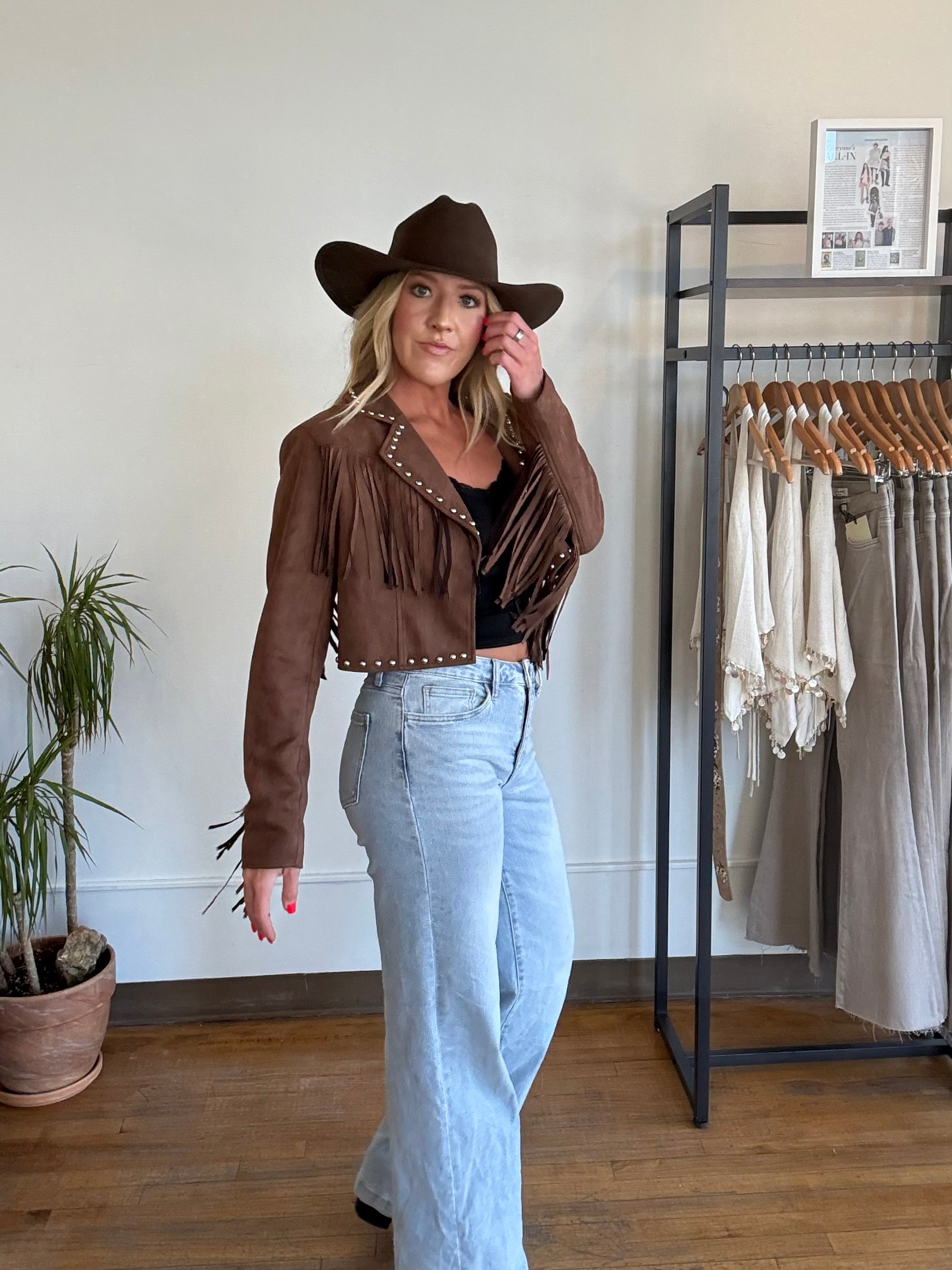 Turn every sidewalk into your own personal runway with our Studded Fringe Jacket — a bold, cowgirl-chic essential for fall and beyond. This cropped suede jacket brings the drama with fringe movement and studded accents that shimmer with every step.