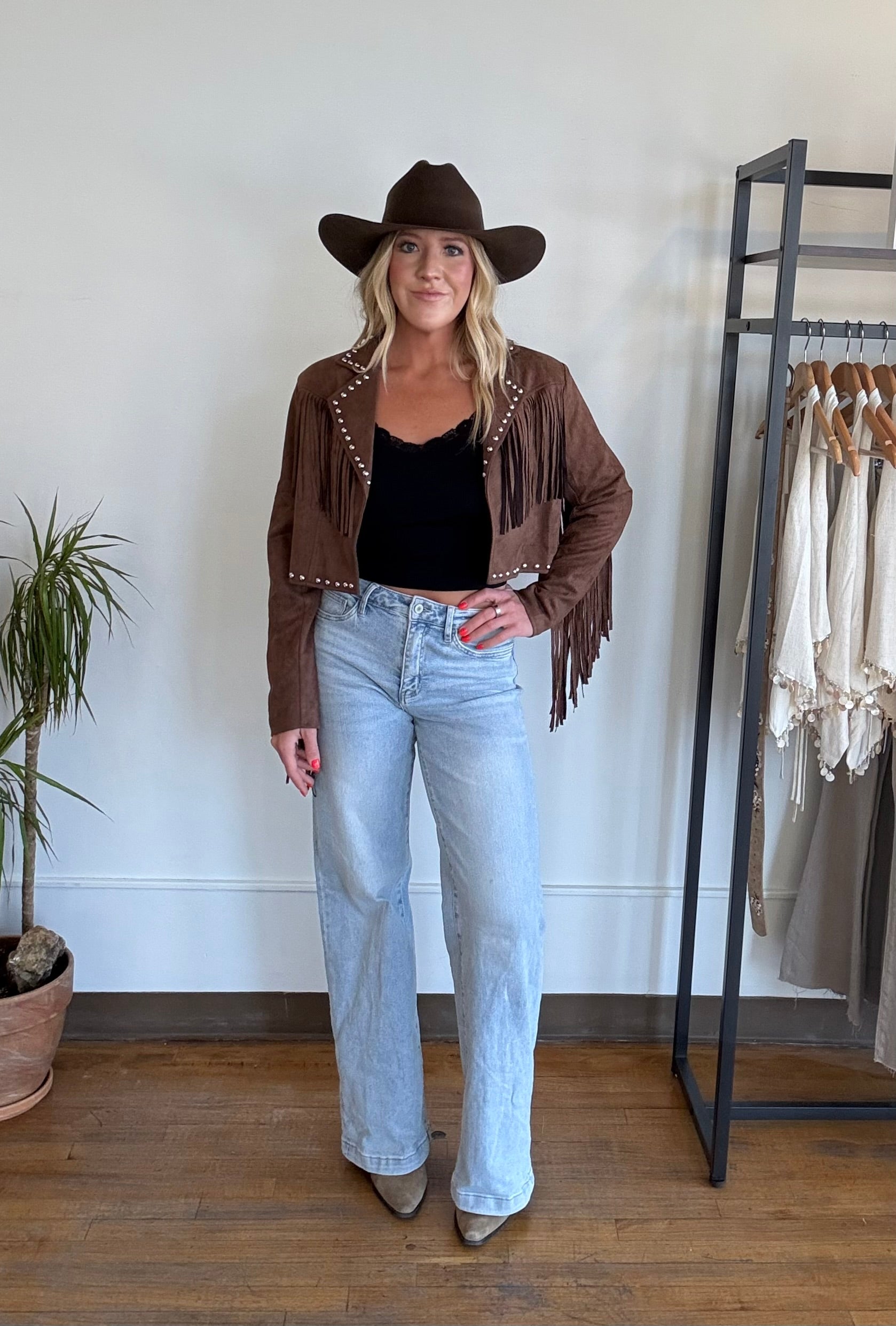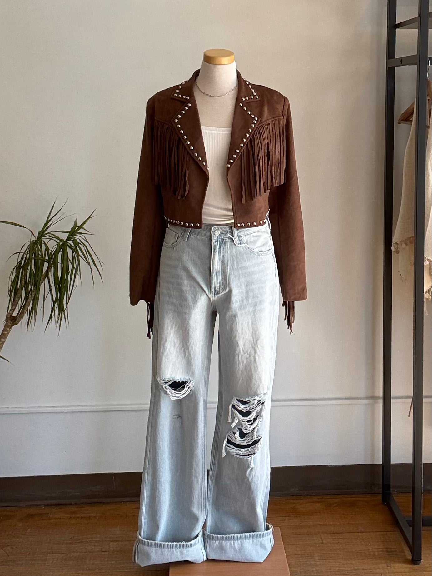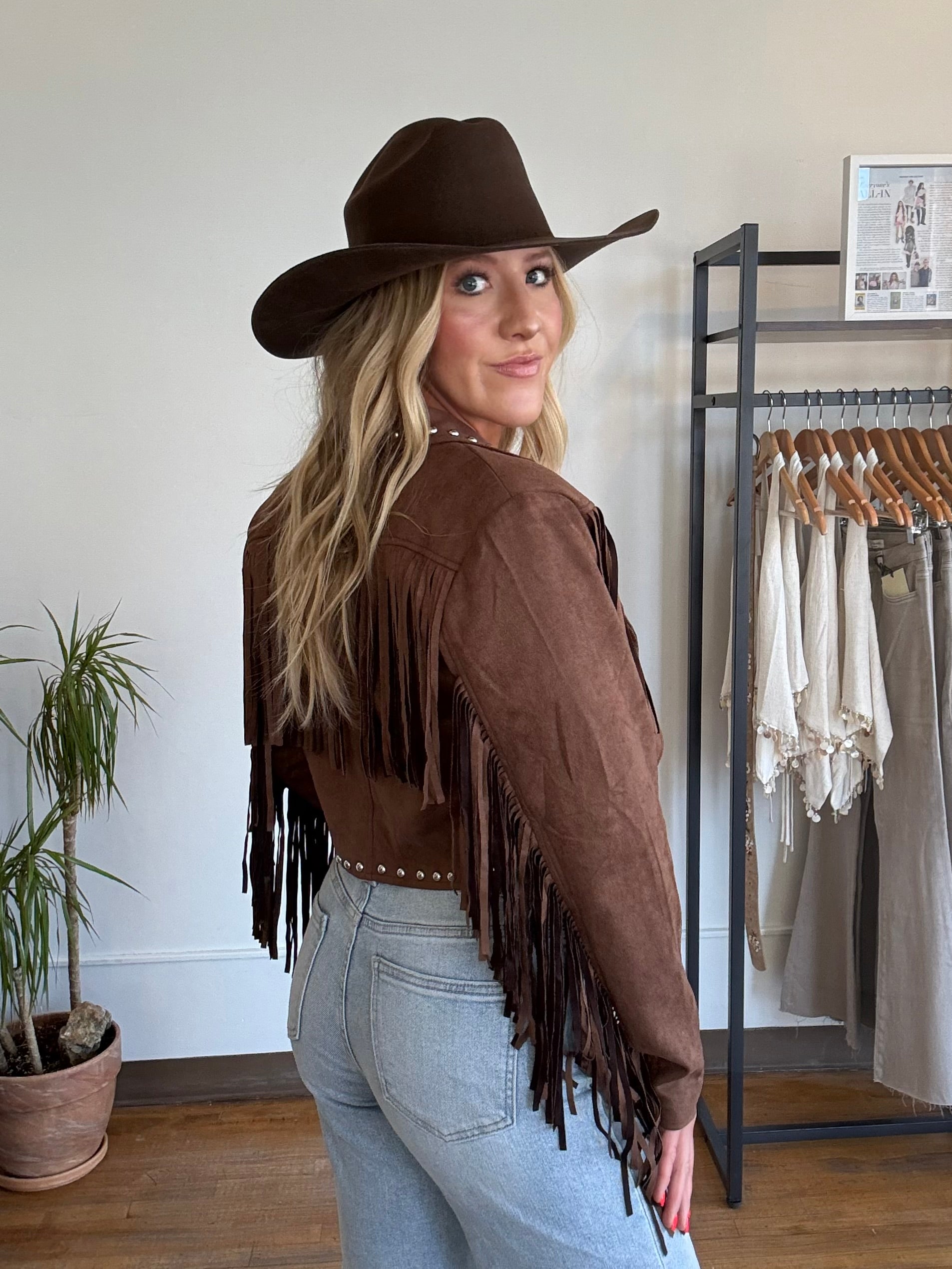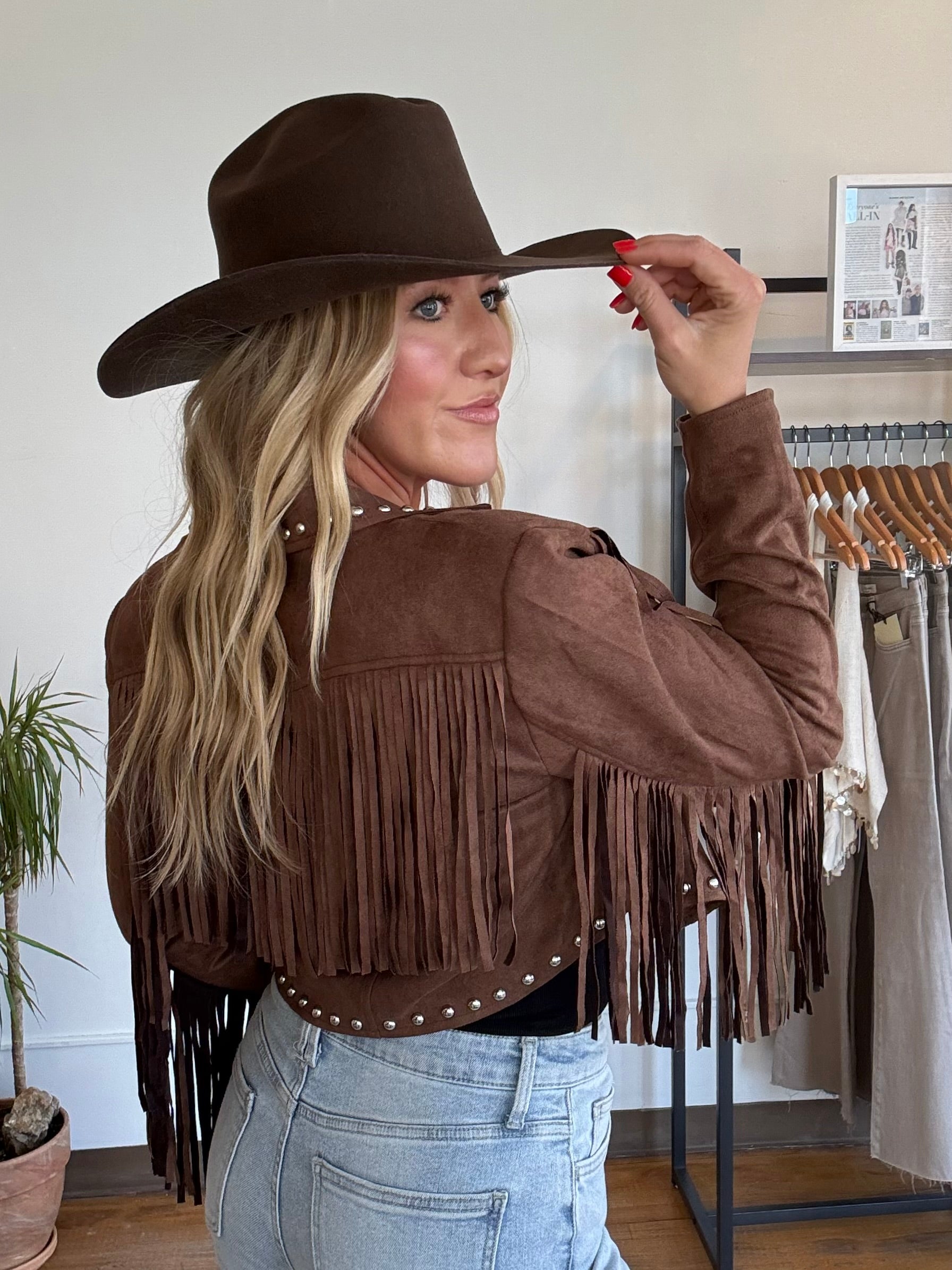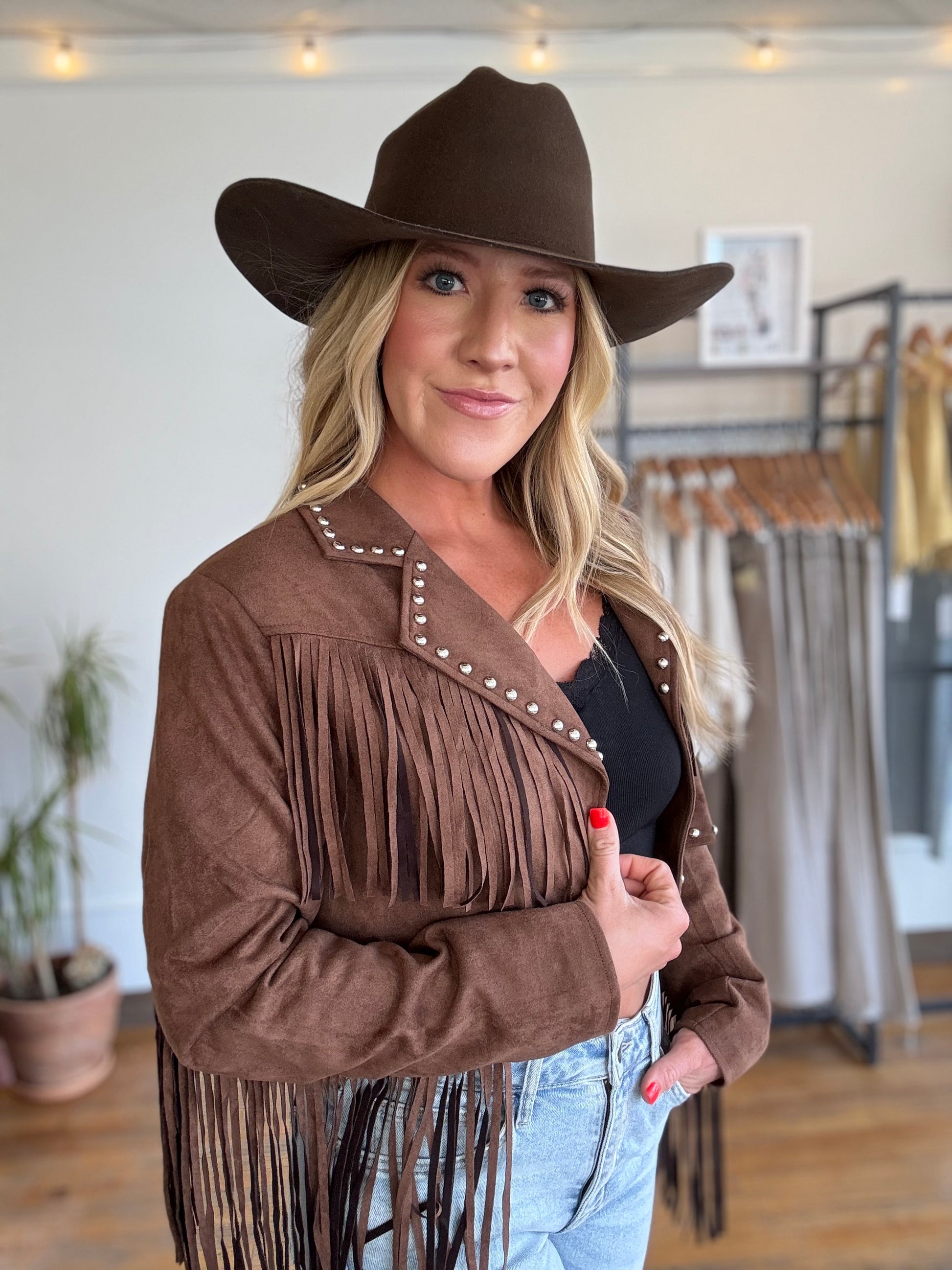 Turn every sidewalk into your own personal runway with our Studded Fringe Jacket — a bold, cowgirl-chic essential for fall and beyond. This cropped suede jacket brings the drama with fringe movement and studded accents that shimmer with every step.