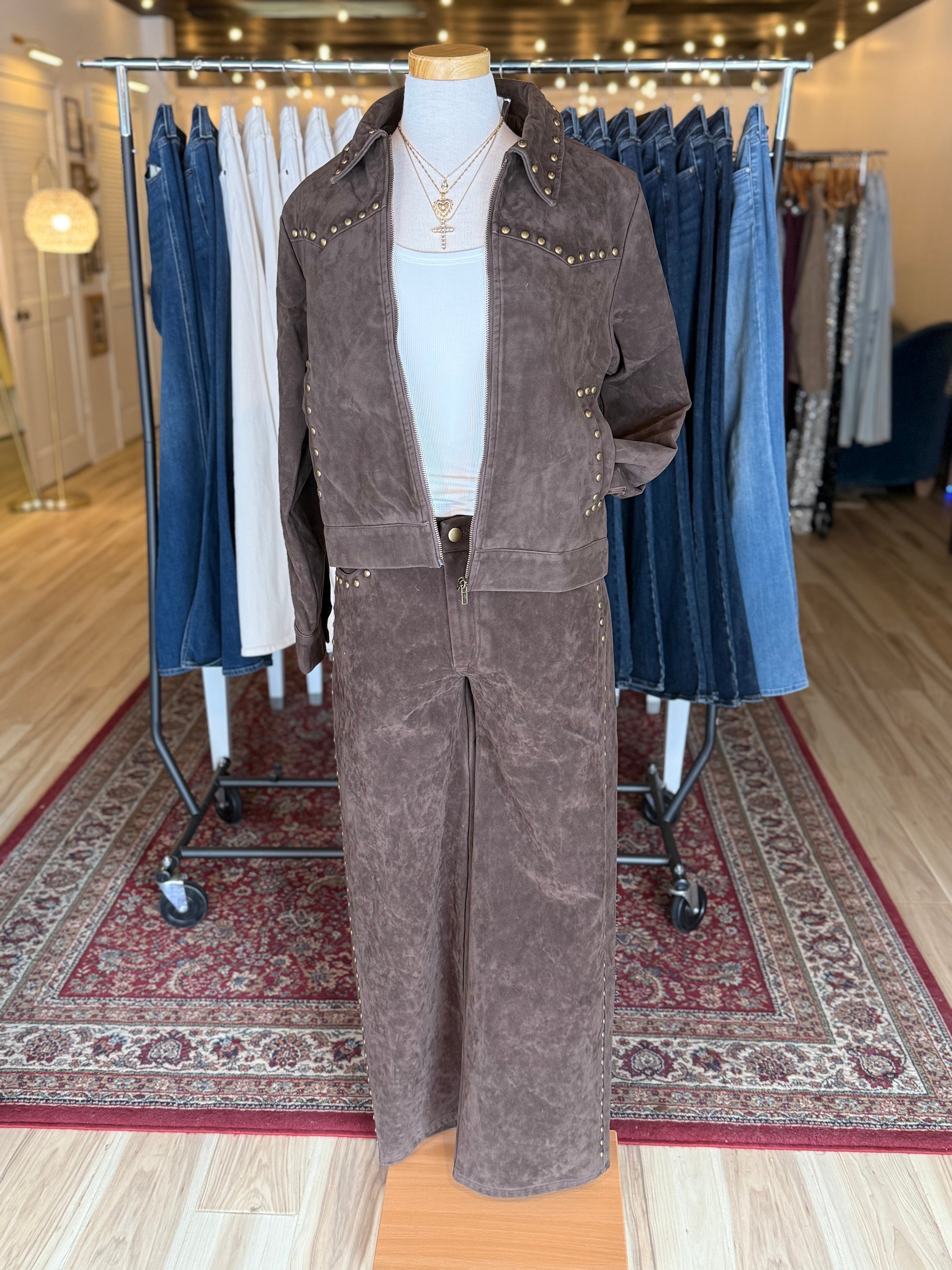 A refined take on western edge. The Studded Suede Jacket is crafted from a rich, heavyweight faux suede that delivers structure, texture, and unmistakable presence. Thoughtfully placed stud detailing along the collar and pockets adds a subtle statement without overpowering the look. Designed to feel timeless yet bold, this jacket brings elevated cowgirl energy to modern styling—perfect for layering over denim, dresses, or coordinating suede pieces.